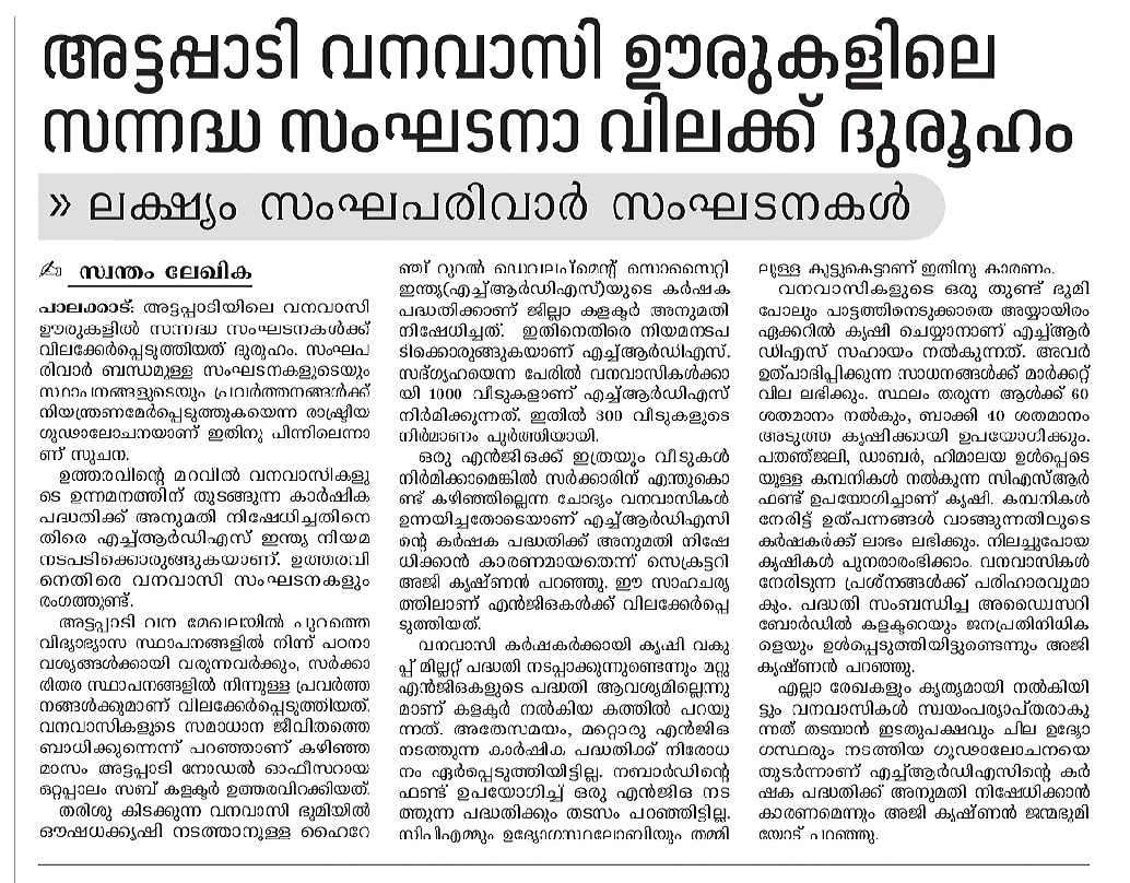 HRDS to build 1,000 houses in Attappadi for tribals